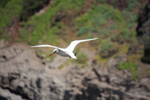 Nous nous dirigeons ensuite vers le nord de l’île, avec tout d’abord un arrêt à la réserve d’oiseaux de Kilauea, où se trouvent de nombreuses espèces rares et endémiques d’Hawaii, que nous nous amusons à identifier: phaétons à queue rouge, fous à pieds rouges, frégate…Malheureusement, nous pensions également apercevoir des albatross, mais ceux-ci ont déjà quitté la région pour leur migration annuelle. Les baleines à bosses, qui viennent chaque hiver dans les eaux clémentes d’Hawaii pour se reproduire, ont également déjà déserté cette côte, mais nous apercevons tout de même dans la baie, des dauphins à long bec (spinner) par dizaines.