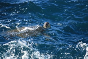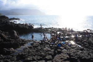 Nous nous dirigeons ensuite tout au bout de cette route du nord. A son extrémité débute la côte Na Pali, accessible uniquement par bateau, par une longue randonnée, ou encore observable par les airs. Ne pouvant donc pas aller plus loin, nous faisons demi-tour et nous nous arrêtons à Princeville, où se trouvent le Queen’s bath. Il s’agit d’un bassin protégé par des rochers, qui se remplit d’eau de mer au gré des vagues et des marées. Il est ainsi possible de s’y baigner en toute tranquillité, alors que les vagues alentours se fracassent sur les rochers. Seules des tortues vertes peuvent ici braver la force de l’océan, avec une facilité déconcertante.