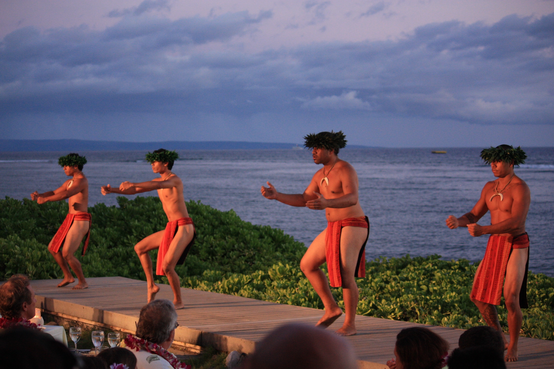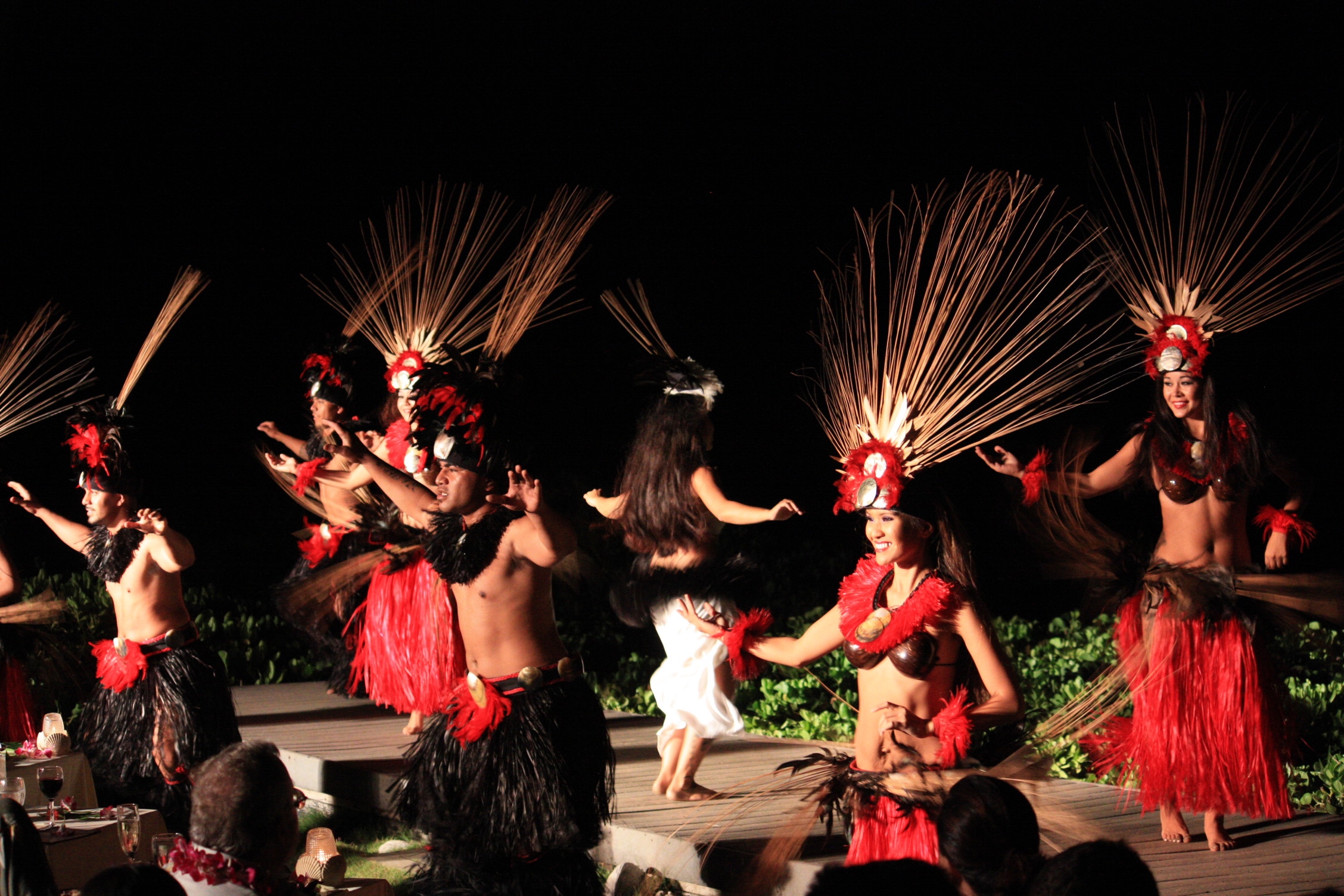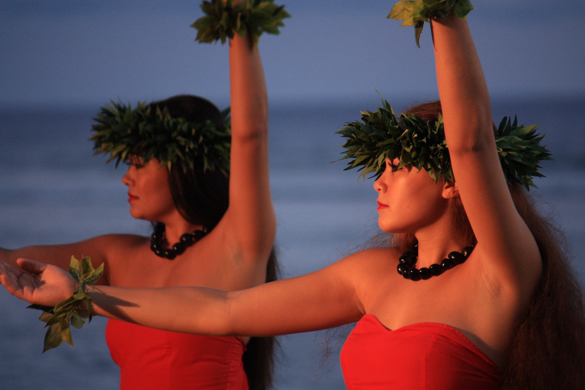 Pendant que nous nous régalons, les danseurs effectuent un hula, tout en feuilles, fleurs et sensualité.