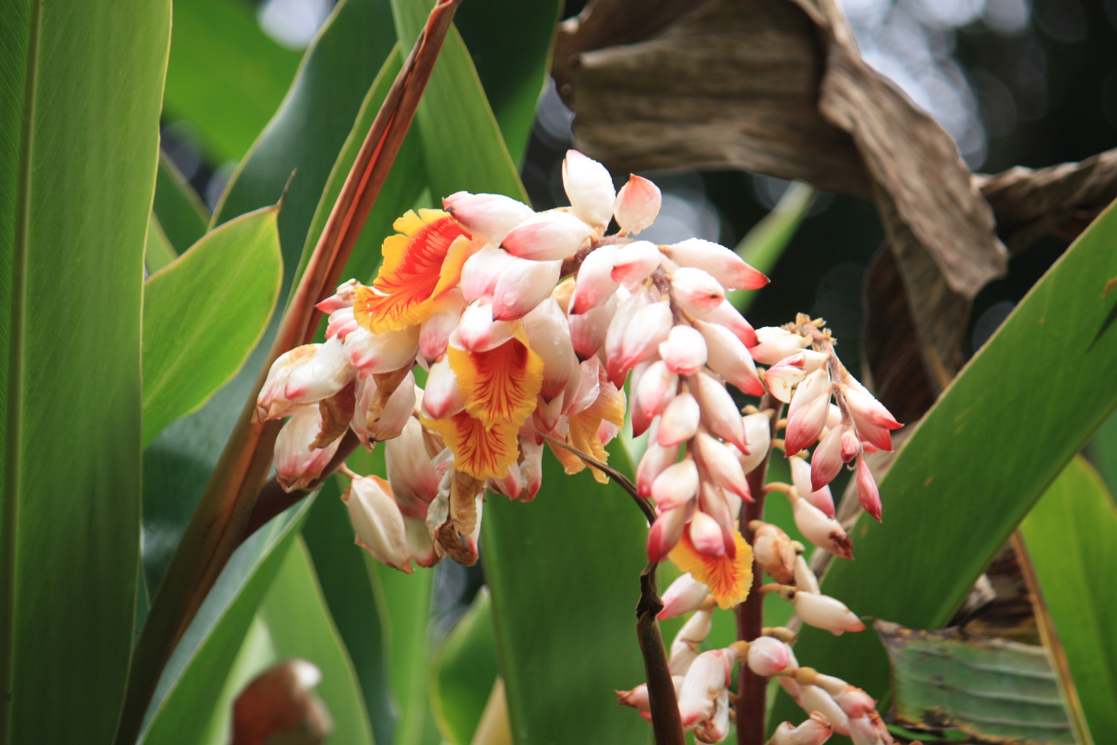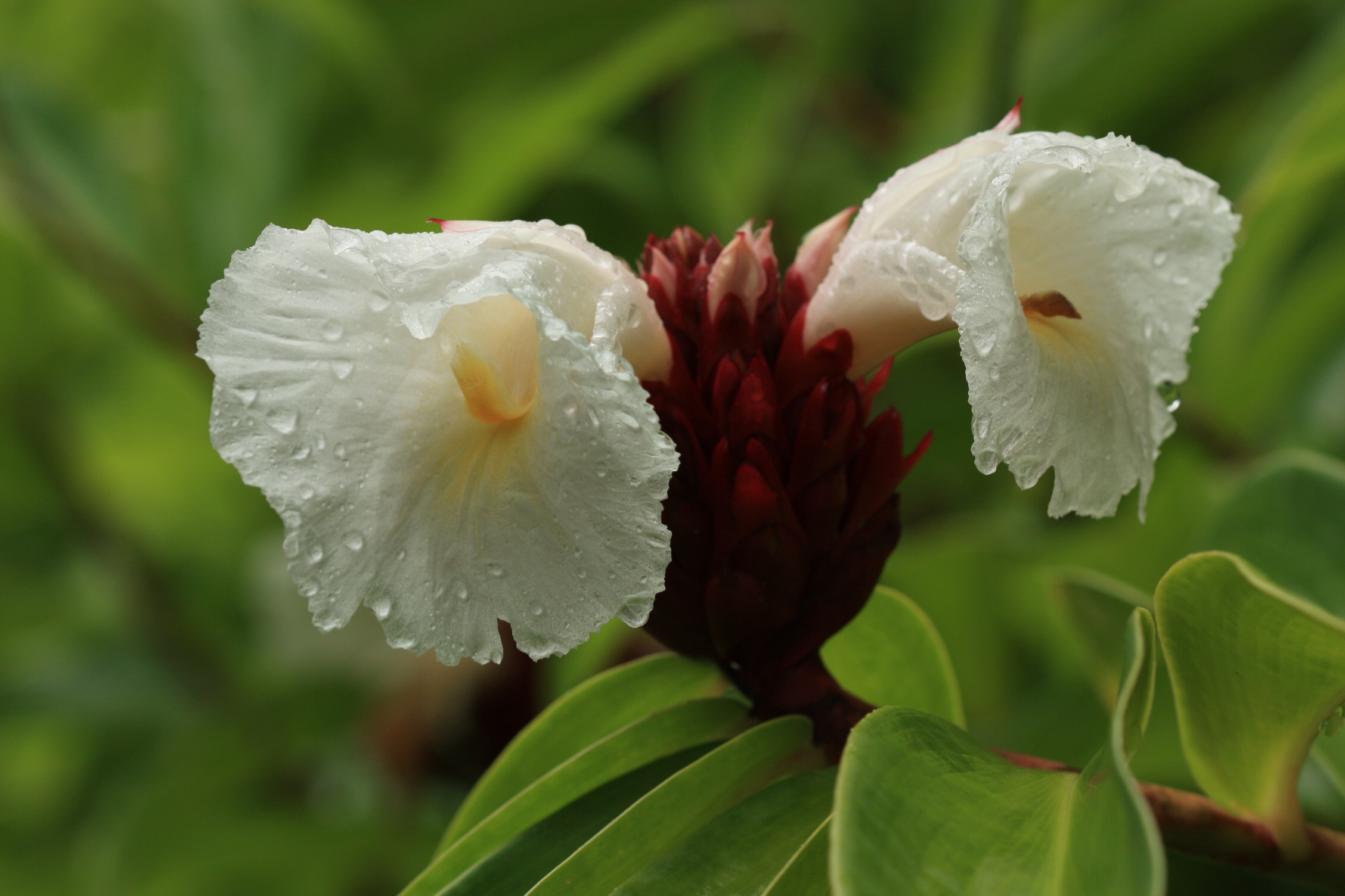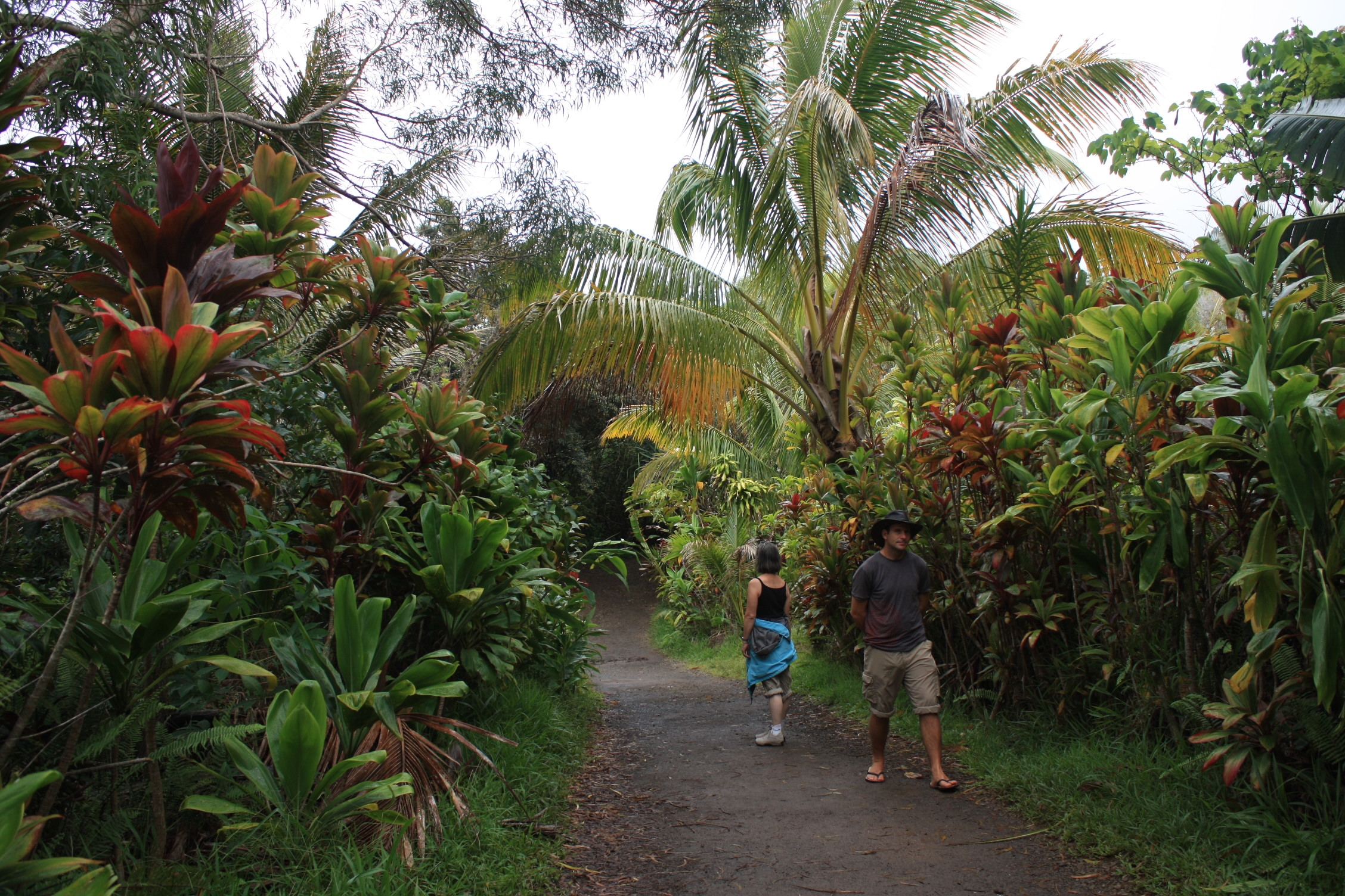 Notre première halte est aux Twin falls, qui s’atteignent après une petite marche à travers un jardin tropical. C’est d’ailleurs davantage cette balade qui nous plaît que la cascade en elle-même, car les fleurs que nous croisons sont superbement colorées, odorantes, et dépaysantes! Cependant, qui dit jardin tropical dit également moustiques, et malgré la petite pluie du jour, mes jambes deviennent rapidement le centre d’attention de ces assoiffées de sang, gâchant un peu la balade. Les chutes d’eau, quant à elles, se trouvent dans un écrin de verdure et d’eau, qu’il faut traverser pour s’en approcher. Du coup, seul mon père est allé les voir de près et nous autres nous contentons d’un aperçu lointain.