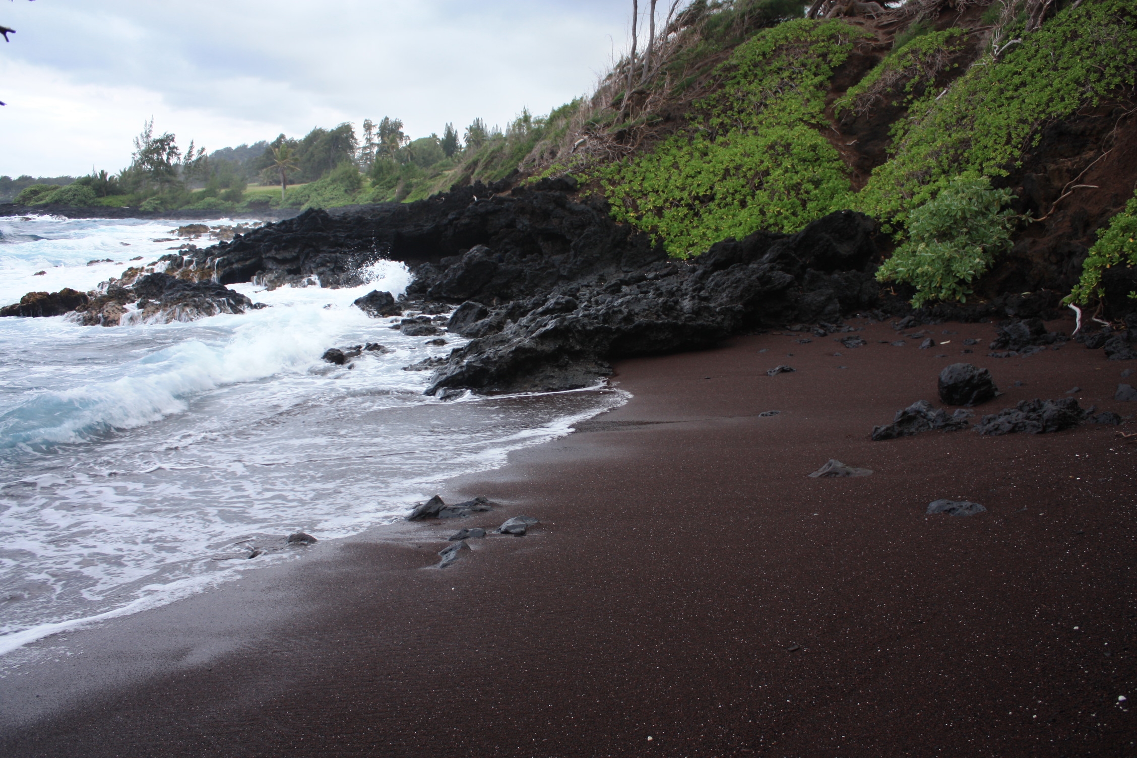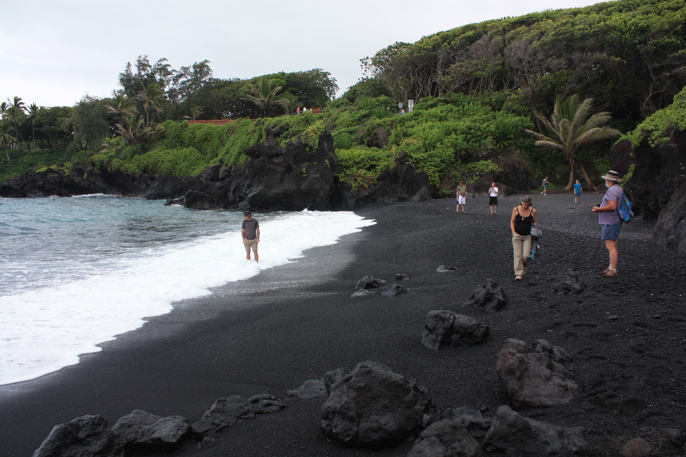 L’étape suivante est la plage de Waianapanapa, qui résulte de la dégradation d’une coulée de lave, et qui est donc composée de sable noir. Il s’agit en fait plus de cailloux que de sable fin, mais elle est tout de même superbe, d’un profond noir charbonneux lorsque les vagues viennent la mouiller. Nous touchons enfin ici, un peu de l’activité volcanique de Hawaii.