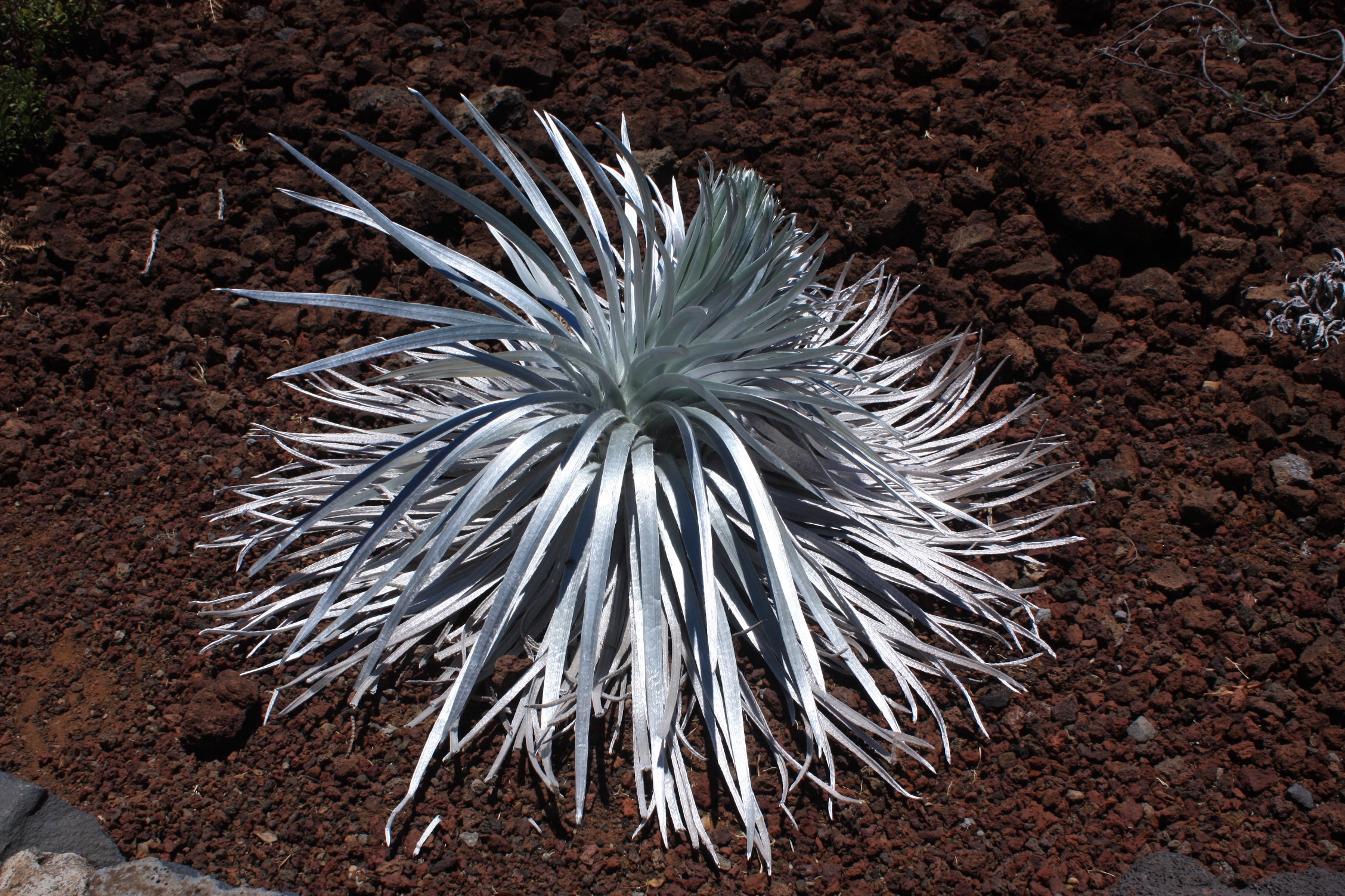 La plante (rare, menacée de disparition) photographiée dans la caldeira est une « silversword », une épée d’argent : bien trouvé ! Elle peut vivre jusqu’à une cinquantaine d’années, ne fleurit qu’une fois, et meurt !