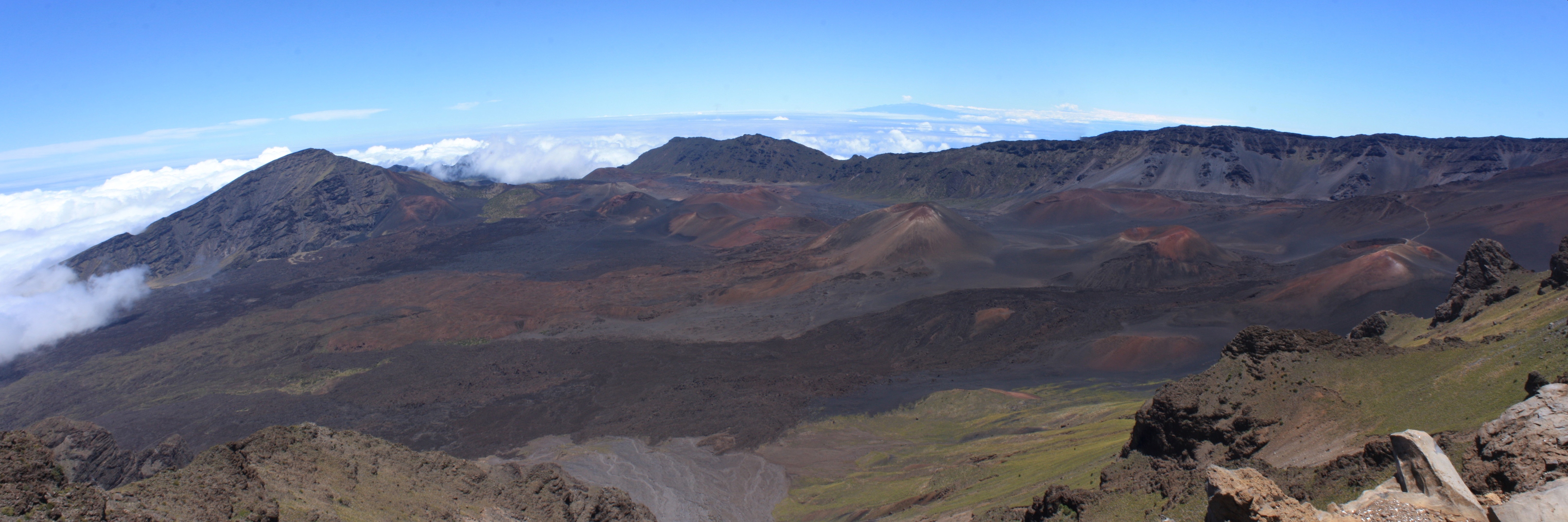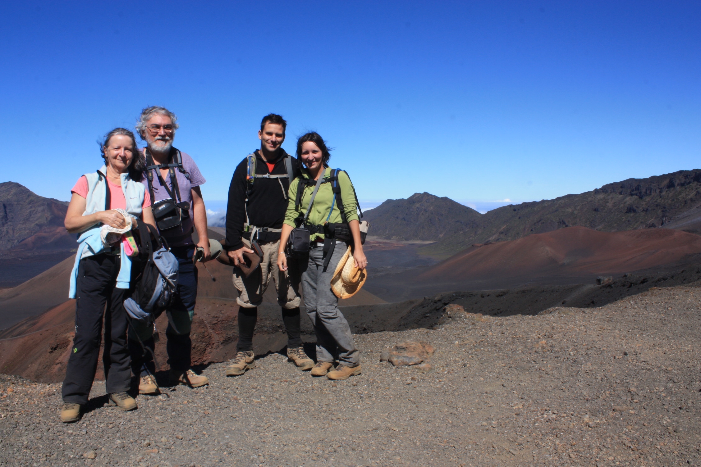Après quelques pauses lookouts, nous arrivons au centre d’informations, peu avant le sommet. A cette altitude, l’air est appauvri en oxygène, ce qui peut causer des dérangements comme des essoufflements, des nausées, des vertiges…Comme nous nous sentons tous bien, nous faisons la randonnée que nous avions envisagée. Il s’agit du début de la traversée de la caldeira du volcan, qui mène à l’un des cratères en son centre: 500m de dénivelé, 40 minutes pour l’atteindre, le double pour remonter, le tout dans un décor surréaliste. Cette immense caldeira, remplie de ses petits cratères, et qui n’a pour seule végétation des silverswords, une plante argentée qui ne fleurit qu’une seule fois au cours de ses 50 ans de vie, est un véritable paysage lunaire. Des astronautes viennent d’ailleurs s’entraîner ici pour tester leur équipement!