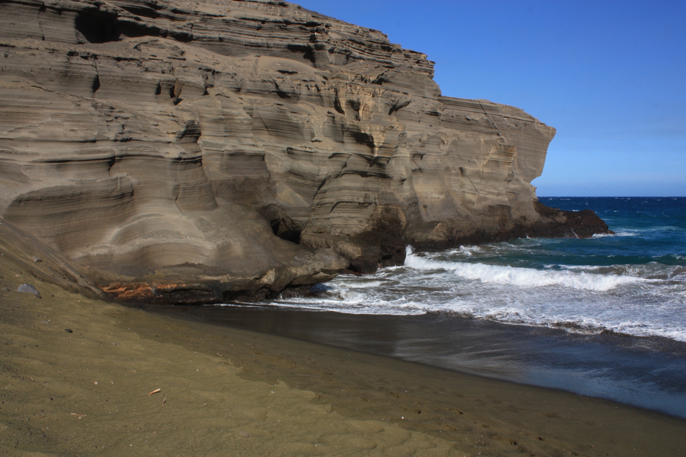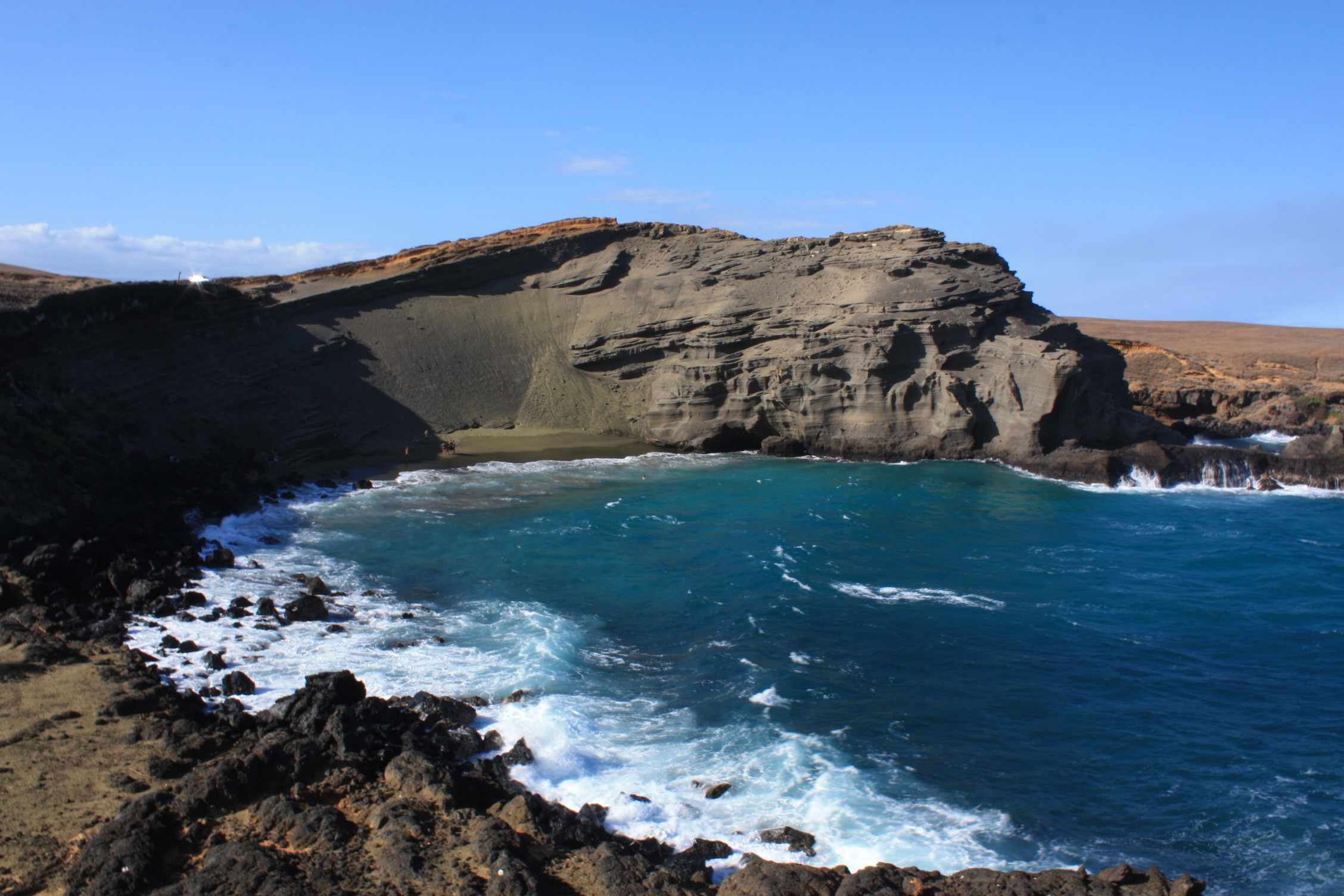 Nous continuons notre route vers la pointe sud de l’île, avec un but bien précis. Lorsque la route devient impraticable pour notre voiture standard, nous nous parons de nos chaussures de randonnée, et tout en luttant contre le vent et le sable dans les yeux, nous longeons la côte pendant 5 km. Enfin, nous arrivons à destination: la petite plage Papakolea (ou Pu’u Mahana) se trouve en contrebas de la falaise. Qu’a t-elle donc de si particulier? Eh bien son sable est…vert! Vert olive pour être plus précise. Cette couleur est due à la présence de cristaux d’olivine, provenant de l’érosion marine qui affecte ce cône de cendres. L’olivine est un des composants courants de la lave de Hawaii, et l’un des premiers cristaux à se former lors du refroidissement de la lave. Etant plus durs et plus denses que la cendre et les débris de lave, ils ont ainsi tendance à s’accumuler sur la plage. Quoi qu’il en soit, cela nous change des sables coralliens blancs, sédimentaires dorés ou volcaniques noirs! Les roches au sommet de la falaise sont également incrustées de cristaux d’olivine plus ou moins gros, et il nous est très difficile de ne pas nous encombrer de nombreux échantillons, tous plus beaux (et lourds) les uns que les autres!