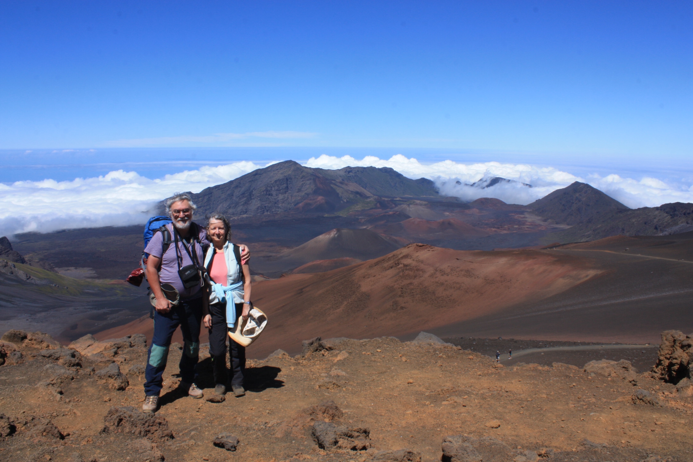 Sur Maui, nous avons aimé sa côte nord-est, tellement pluvieuse que les fleurs tropicales poussent comme de la mauvaise herbe, alors qu’en France, nous payons à prix d’or un plant de celles-ci, que nous n’arrivons pas à garder plus de quelques années, dans nos conditions tempérées. Nous avons également été émerveillés par le volcan Haleakala et sa caldeira aux teintes rouges/brunes, à l’aspect lunaire et dégagée de tout nuage.