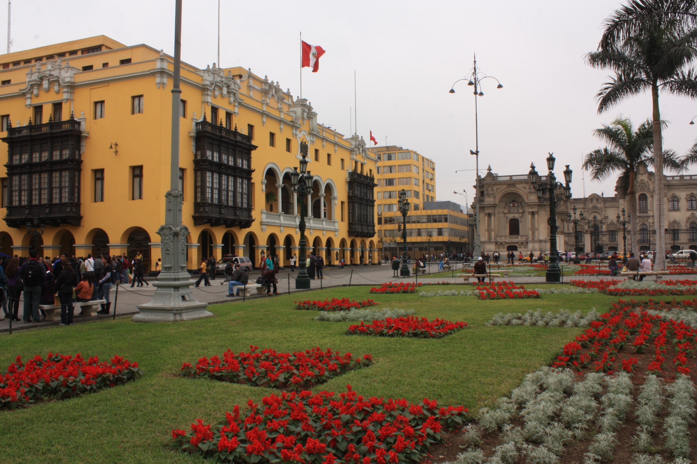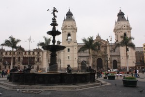 La ville conserve un patrimoine architectural important de l’époque coloniale et son centre-ville a ainsi été inscrit au patrimoine mondial de l’UNESCO en 1991. Bien que sous la grisaille une bonne partie de l’année, comme c’est le cas en ce moment, Lima est néanmoins une ville sympathique à visiter, notamment grâce aux couleurs vives des maisons qui égayent considérablement le tableau. Sa place principale, la Place des Armes ou Plaza Mayor, est le coeur de la cité créée par F.Pizarro, ainsi que le centre de l’Empire espagnol s’étendant à travers le continent. Il ne reste aucun bâtiment d’origine, à l’exception de la fontaine en bronze en son centre, datant de 1650. Cependant, cette place n’en est pas moins magnifique, avec ses bâtiments jaunes vifs aux balcons de bois, et ses parterres de fleurs rouges. Sur un de ses côtés se trouve le Palais de Gobierno, qui sert de résidence au chef de l’Etat, et qui est constamment surveillé par des militaires.