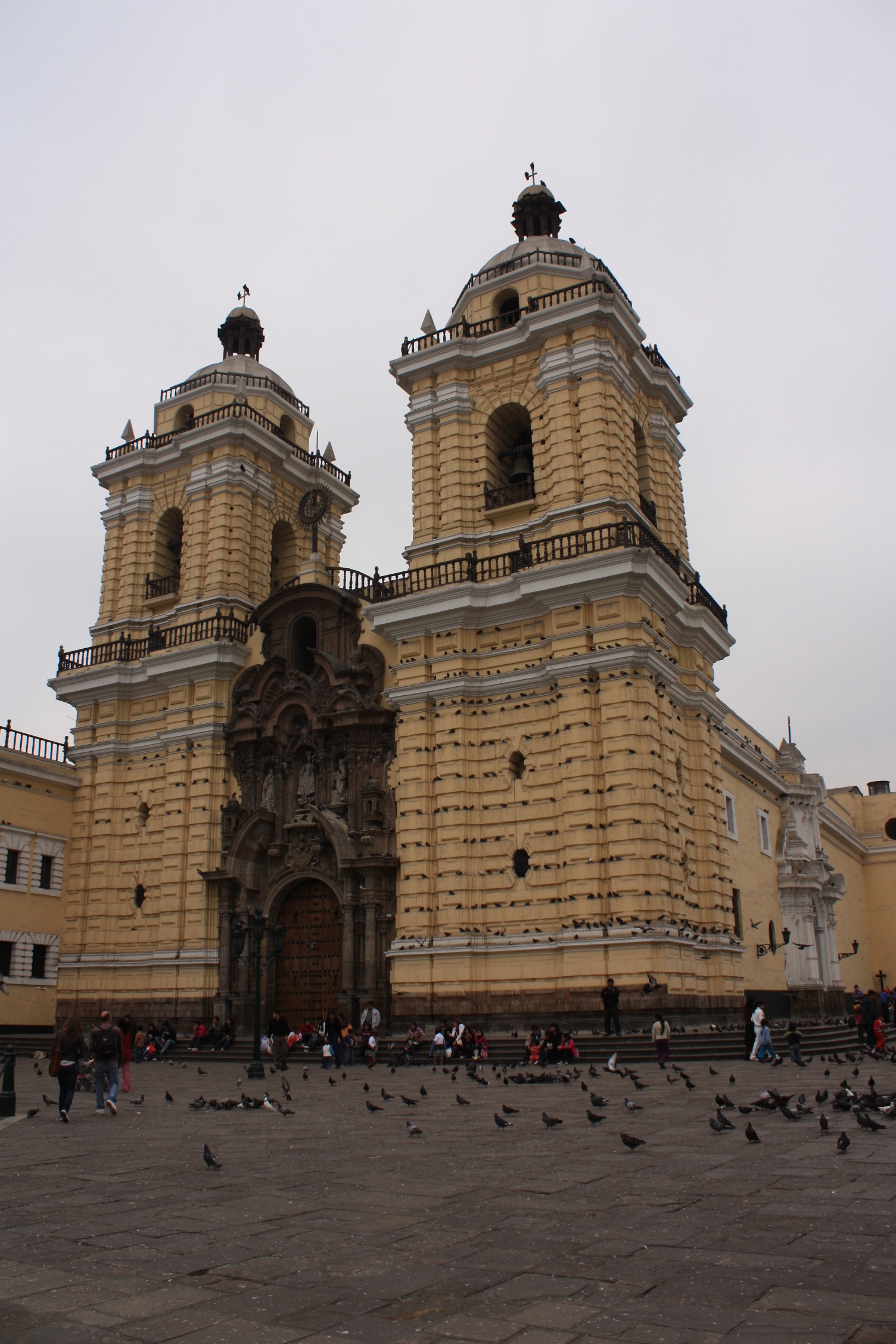 Nous visitons ensuite le monastère-église franciscain de San Francisco, lui aussi jaune, célèbre pour sa très belle bibliothèque, qui renferme 25 000 livres anciens, certains antérieurs à la conquête espagnole, mais malheureusement croulant sous la poussière et abîmés par l’humidité. Il est également réputé pour ses catacombes, avec près de 70 000 sépultures. Les os ont par la suite été classés, formant des tas de plusieurs mètres de profondeur de fémurs, crânes…C’est au cours de la visite guidée de ces catacombes que nous croisons un groupe de français, qui auraient pu tourner le film « les Bronzés à Lima ». Parlant fort et parlant bien, les voici donc qui s’exclament « Beurk, mais quelle culture que d’exposer ainsi ses squelettes! ». Heu…il me semble bien que nous avons la même chose à Paris, non?