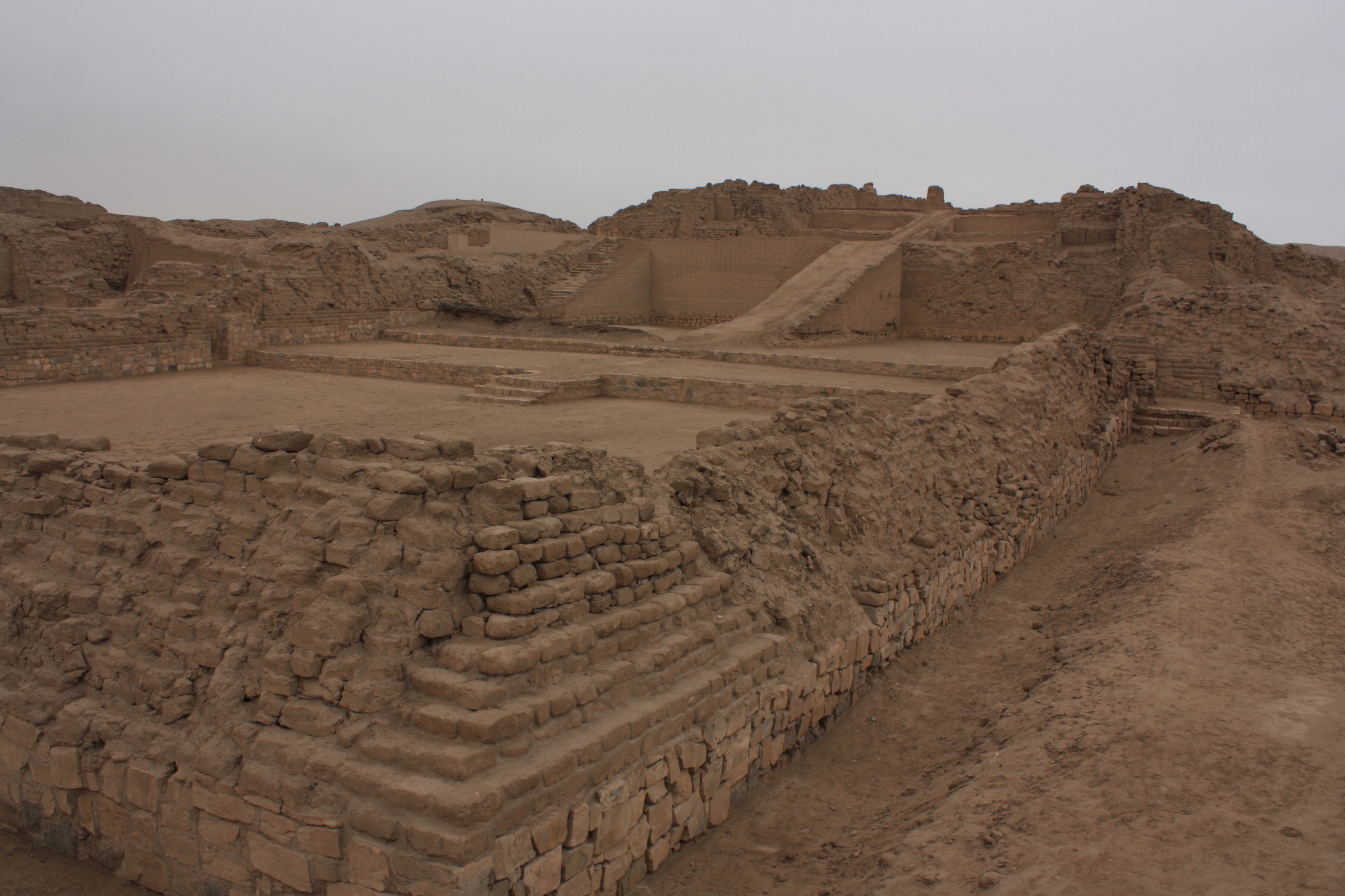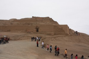 Le lendemain, nous prenons une excursion à la journée pour visiter le site de Pachacamac. Celui-ci, situé à une trentaine de kilomètres de la ville, présente des ruines allant de la civilisation Lima (200-600 après JC) aux Incas (1450-1530). Cette citadelle précolombienne a occupé à différents moments des fonctions de carrefour commercial, de centre religieux et de centre administratif. Dominant les ruines de la cité, le Temple du Soleil a été construit par les Incas entre 1470 et 1533. Il servait pour offrir des sacrifices humains et diverses offrandes au Soleil. Autrefois, il était recouvert de plâtre rouge, rendant l’édifice très impressionnant, pour les habitants de la cité. Pour être honnête, nous n’avons pas été subjugués par cette visite car les ruines au milieu d’un paysage désertique jaune, ne sont pas très bien conservées, à l’exception peut-être du Temple du Soleil. Il est donc très difficile de s’imprégner la vie de l’époque. Cependant, à l’arrivée des espagnols, il s’agissait bien d’un site inca de première importance et d’une ville majeure.