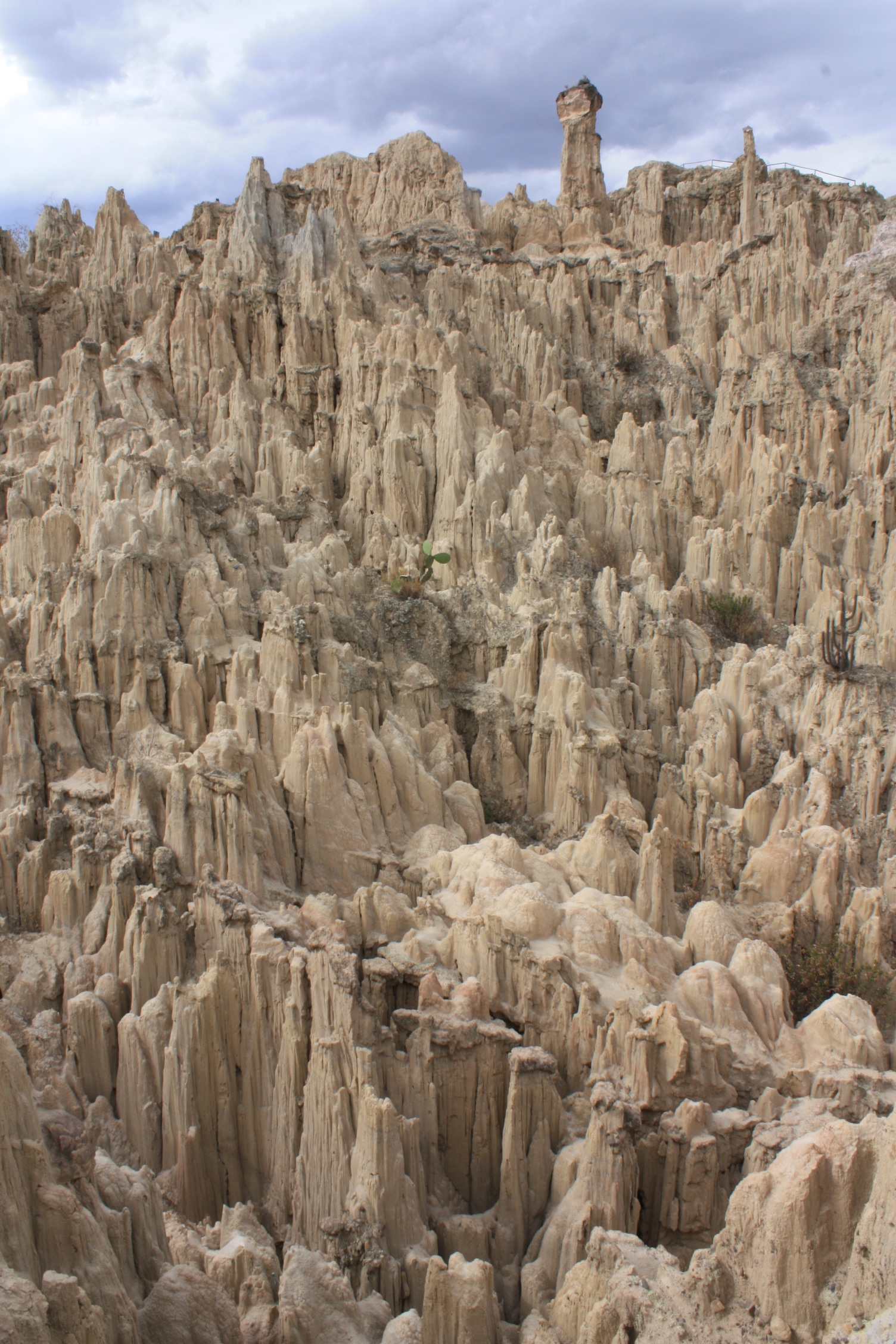 Histoire de sortir de cette ville fade, nous prenons un taxi pour visiter le site de la Vallée de la Lune, à quelques kilomètres de là. Et ici, bonne surprise, loin de l’agitation citadine, les paysages sont magnifiques!! Les montagnes sont formées d’argile, dont les minéraux (ou du moins leurs proportions), diffèrent d’une montagne à l’autre, créant ainsi des versants de couleurs variées, allant du beige-marron au rouge-violet. Cet argile, fragile, a été érodé de manière très surprenante au cours des siècles, formant ici un semblant de désert de stalagmites ocres.