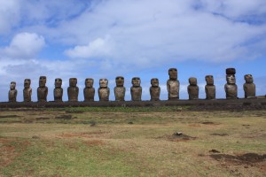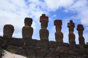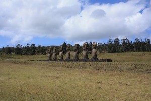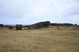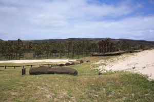 Ce premier contact avec des moaïs loin de la ville, nous fait prendre conscience que nous sommes bien sur l’île de Pâques, tant de fois vue en photo ou dans des documentaires à la télévision. Ces colosses de pierre aux lèvres pincées, au nez épais et aux longues oreilles, contemplent l’intérieur des terres d’un air résigné. Ils ont été érigés pour répandre leur mana sur leurs descendants, ils le répandront donc et tant pis pour la vue magnifique de la plage, à laquelle ils tournent le dos.