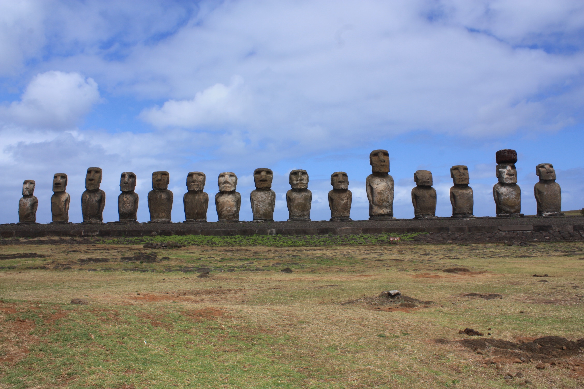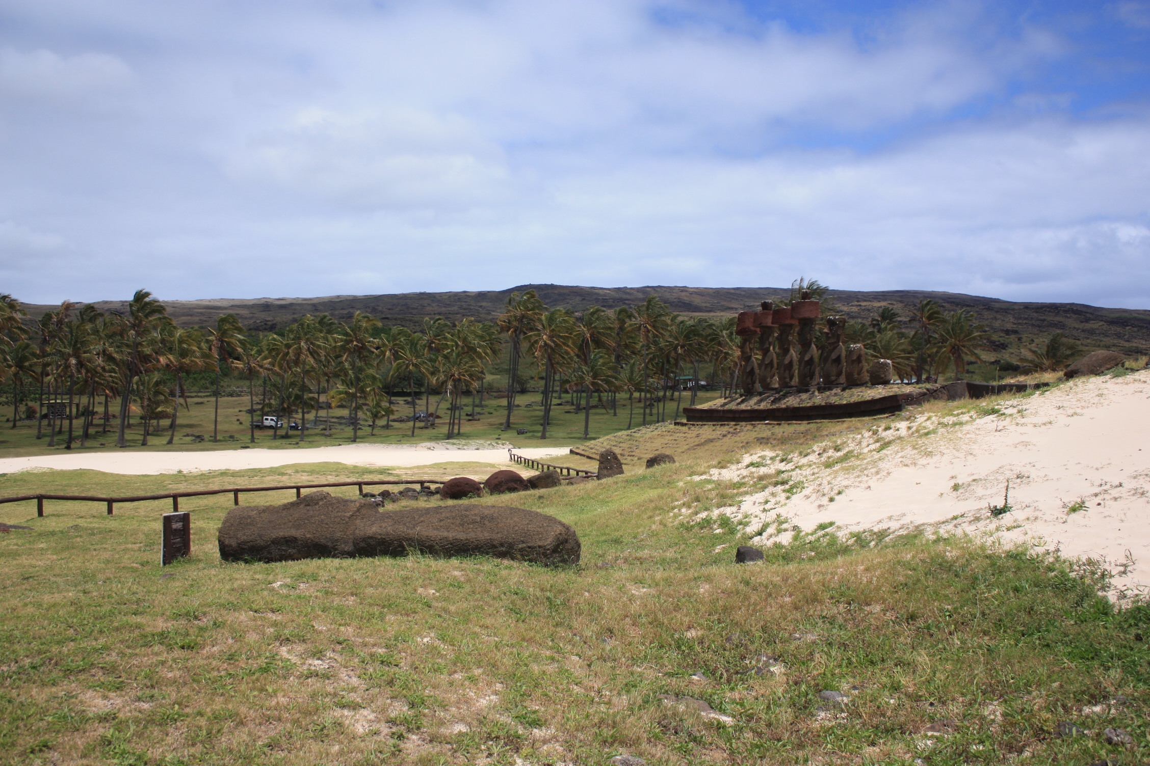L’île dénombre 887 statues, réparties sur l’ensemble du territoire, mais certaines seraient encore enfouies, montant à un millier le nombre de moaïs sculptés. Nous débutons notre découverte du nord de l’île, par Anakena, l’une des 2 seules plages de l’île. C’est sur ce sable blanc qu’aurait débarqué le premier roi, Hotu Matu’a. On y trouve les seuls cocotiers de l’île, importés de Tahiti en 1960, ainsi que l’ahu Nau-Nau et ses 7 moaïs, parfaitement conservés grâce au sable dans lequel ils étaient enfouis. Redressés en 1978, 5 sont encore intacts et 4 ont encore leur pukao, leur chapeau de scorie rouge. Certains présentent des gravures dans leur dos et nous remarquons même une tête de moaï, probablement cassé au moment du redressement et recyclé comme pierre pour l’édifice de l’ahu. Plus loin, une autre statue est toujours par terre, face vers le ciel cette fois. Encore plus loin, une autre est dressée sur son ahu. Sous cette dernière, caché dans le sable, les archéologues ont déniché un indice important: un oeil!