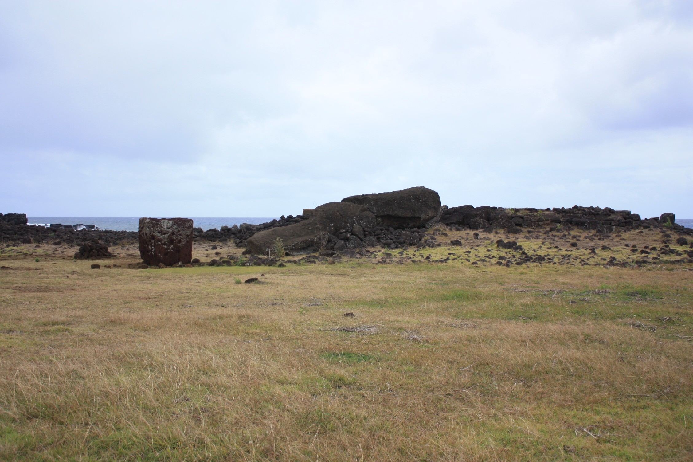 Nous continuons la route en direction de Hanga Roa, visitons d’autres vestiges d’ahus, puis nous terminons la journée par la carrière Puna Pau, où sont fabriqués les pukaos. Tous les chapeaux ont donc été sculptés dans ce volcan de scorie rouge, situé au centre de l’île, avant d’être transportés vers l’ahu, où ils coifferaient leur moaï. Ils sont ici taillés grossièrement et perdaient un tiers de leur volume durant le transport, à cause du phénomène de frottement. Une fois arrivé à destination, le sommet du chapeau était finalisé, avant de rejoindre le crâne de la statue.