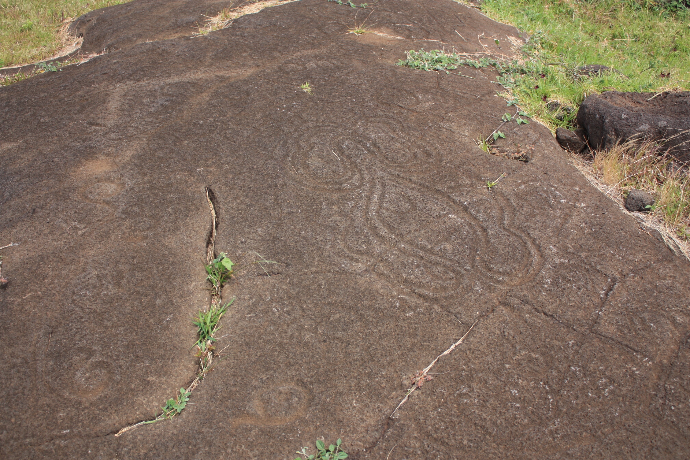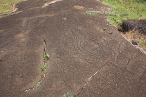 Nous continuons notre route jusqu’à la plage Ovahe, censée être de sable rose, puis jusqu’à l’ahu Te Pito Kura, non restauré, aux statues tombées telles des quilles de bowling. Avec ses 9,80m de long, c’est ici que se trouve le plus grand moaï jamais érigé. Pour preuve de son redressement antérieur, des orbites profondes ont été creusées. On trouve également sur ce site « le nombril du monde », une pierre ovale polie ressemblant à un oeuf, ayant probablement un rapport avec la naissance. On nous avait dit qu’un grand champ magnétique se trouvait au niveau de cette pierre, rendant folles les boussoles, mais celle de notre ami Garmin conserve invariablement son nord…Plus loin, les pétroglyphes de Papa Vaka nous laissent de pierre: nous y distinguons bien un poulpe et un requin, mais que dire des soit-disant chaloupes, tortues, hameçons…?