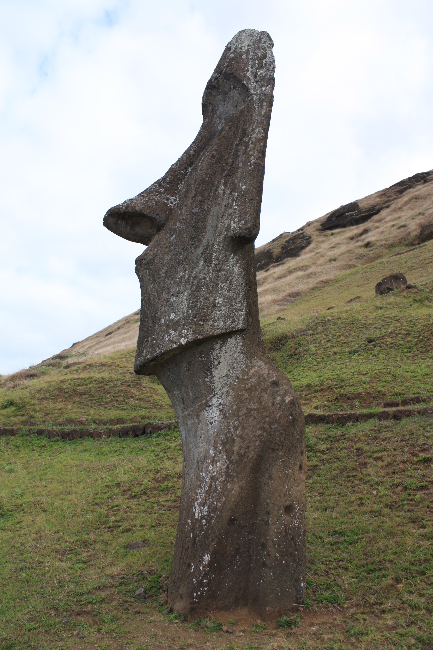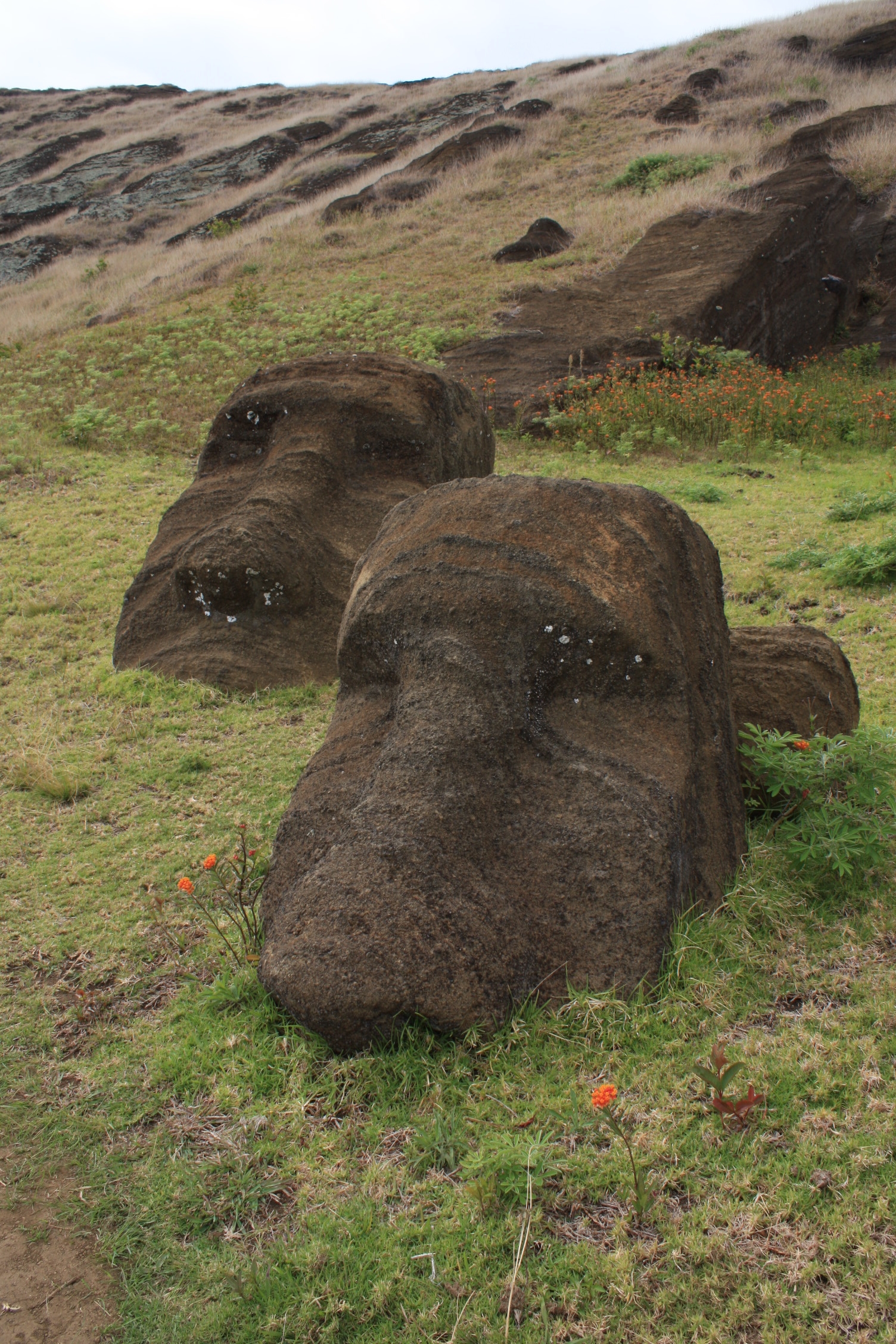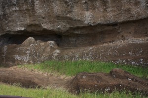 Les moaïs sont sculptés dans la roche, faite de tuf et de cendres compressées, du volcan Rano Raraku que nous visitons le lendemain. Il s’agit là sans aucun doute du site qui nous a le plus fascinés. En effet, des centaines de statues, terminées ou en cours de fabrication encore encastrées dans la roche, parsèment les flancs de cette montagne. Certaines sont à moitié ensevelies, d’autres ont été dégagées, d’autres se distinguent à peine dans la falaise, signe que le travail venait tout juste de débuter, d’autres encore ont été abandonnées un peu plus en contrebas, au cours du transport vers leur ahu. Leurs yeux sont peu creusés et leur tête est nue, puisque tout cela doit être finalisé sur l’ahu. On trouve ici différents styles de moaïs, mais fait étonnant et unique, l’un a été sculpté avec des genoux et probablement une barbe. Sur ce site gît également le plus grand moaï jamais sculpté, avec près de 22m de long! Il ne fait encore qu’un avec le flanc de son géniteur, mais il est de toutes façons fort probable qu’il n’aurait pas pu être déplacé sans être cassé! Plus encore ici qu’ailleurs sur l’île, le temps semble s’être figé. Les moaïs nous donnent l’impression d’attendre patiemment qu’on les termine, qu’on les envoie là où ils pourront jouer leur rôle.