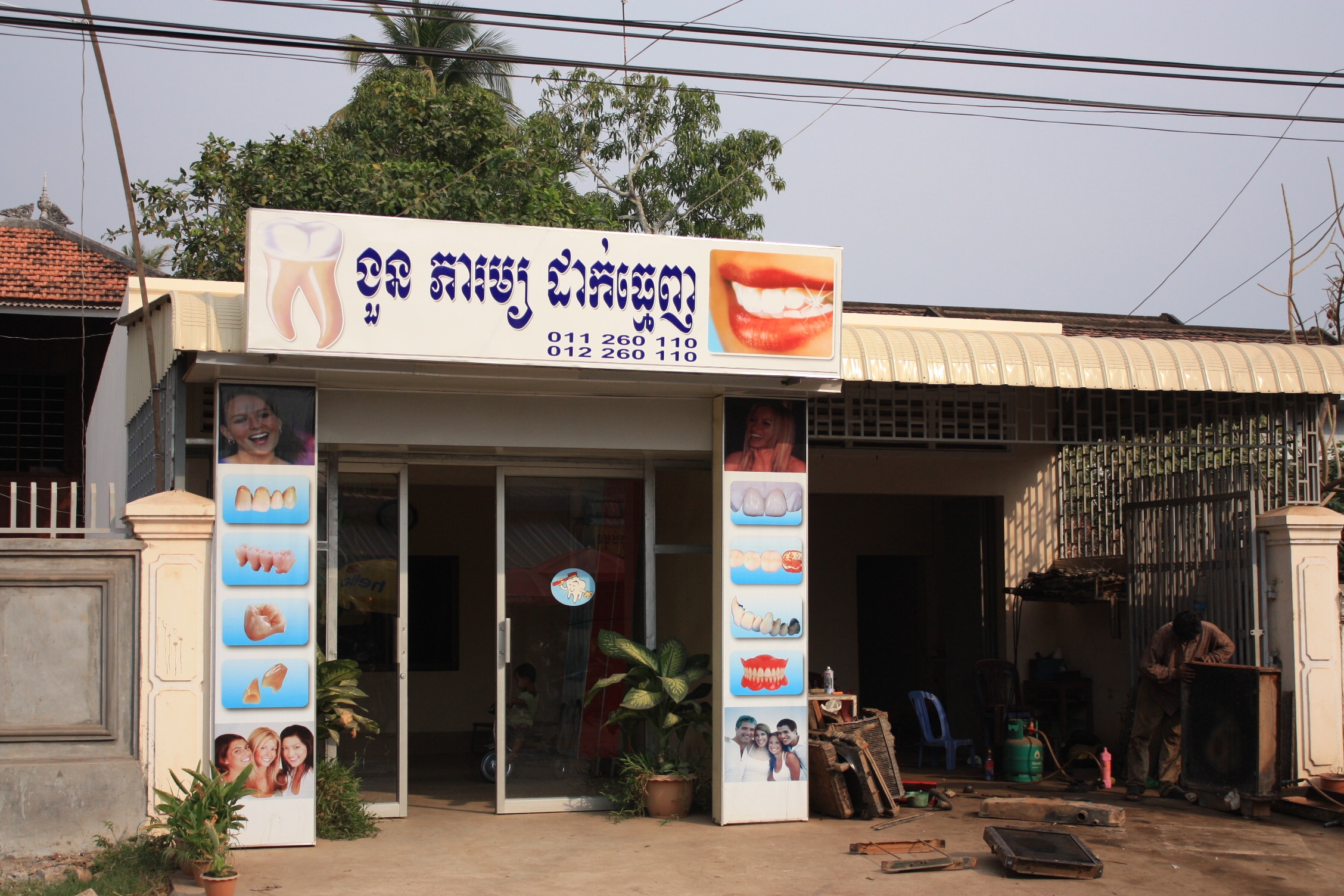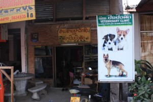 A Elfie: Laos, Vang Vieng: On ne devine qu'il s'agit d'un véto que grâce aux panneaux. Dans la boutique se trouvent des tissus et des machines à coudre...On n'a pas bien compris du coup!